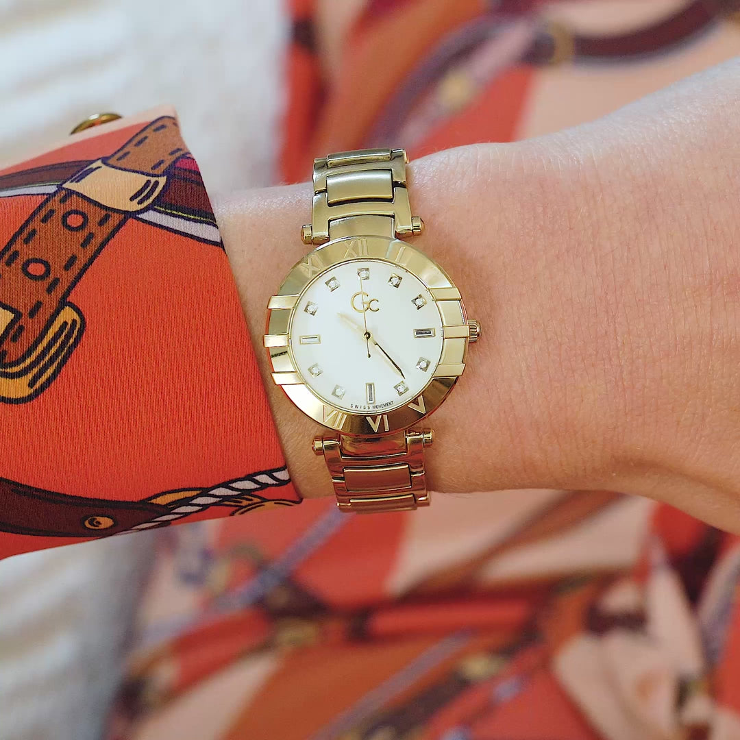Wear confidence in your sleeve with this sleek all yellow gold tone ladies timepiece. The 32mm case with a top ring is decorated with three stripes in relief and engraved roman numeral. The white sunray dial is enhanced with crystal indices and baguettes. The refined H-link bracelet with the shaped middle link is echoing the roundness of the case.