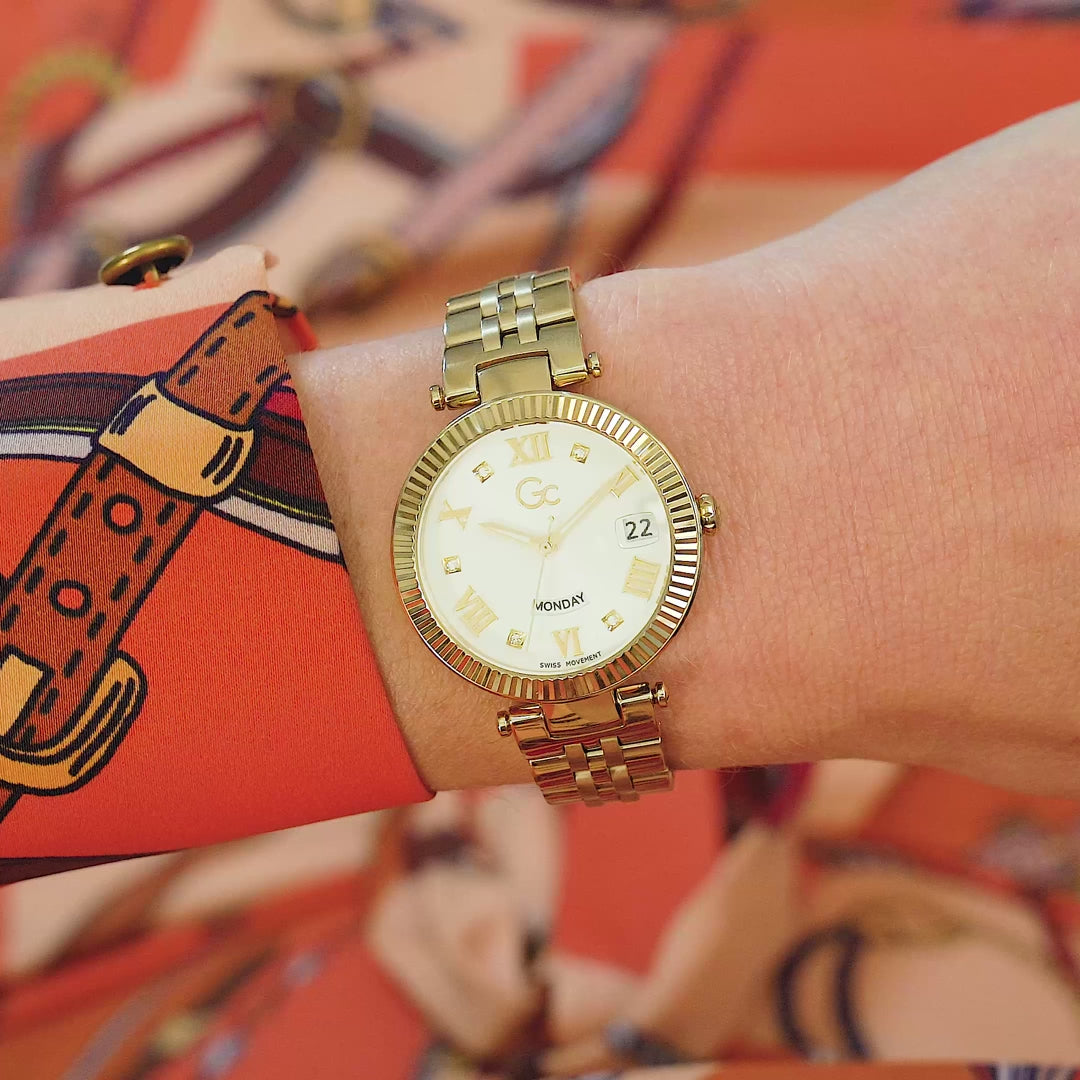 Add a touch of refinement to your everyday wardrobe with the Gc Flair. It has a distinctive notched bezel and a comfortable, supple five links bracelet and, for all yellow gold tone version, an eye-catching sunray white dial with a visible day date swiss movement through windows at 3 and 6 o'clock.