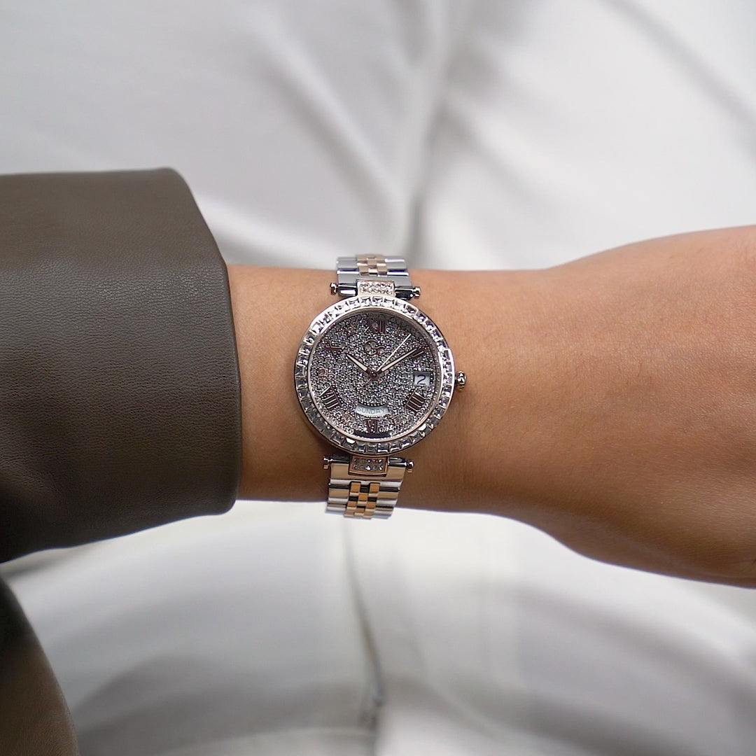 The Gc Flair (34mm) goes glamorously wild in this two-tone silver and rose gold PVD version with a sparkling full pave dial of crystals and an eye-catching set of crystals on the top ring. The day and the date are visible through the windows at 3 & 6 o'clock.