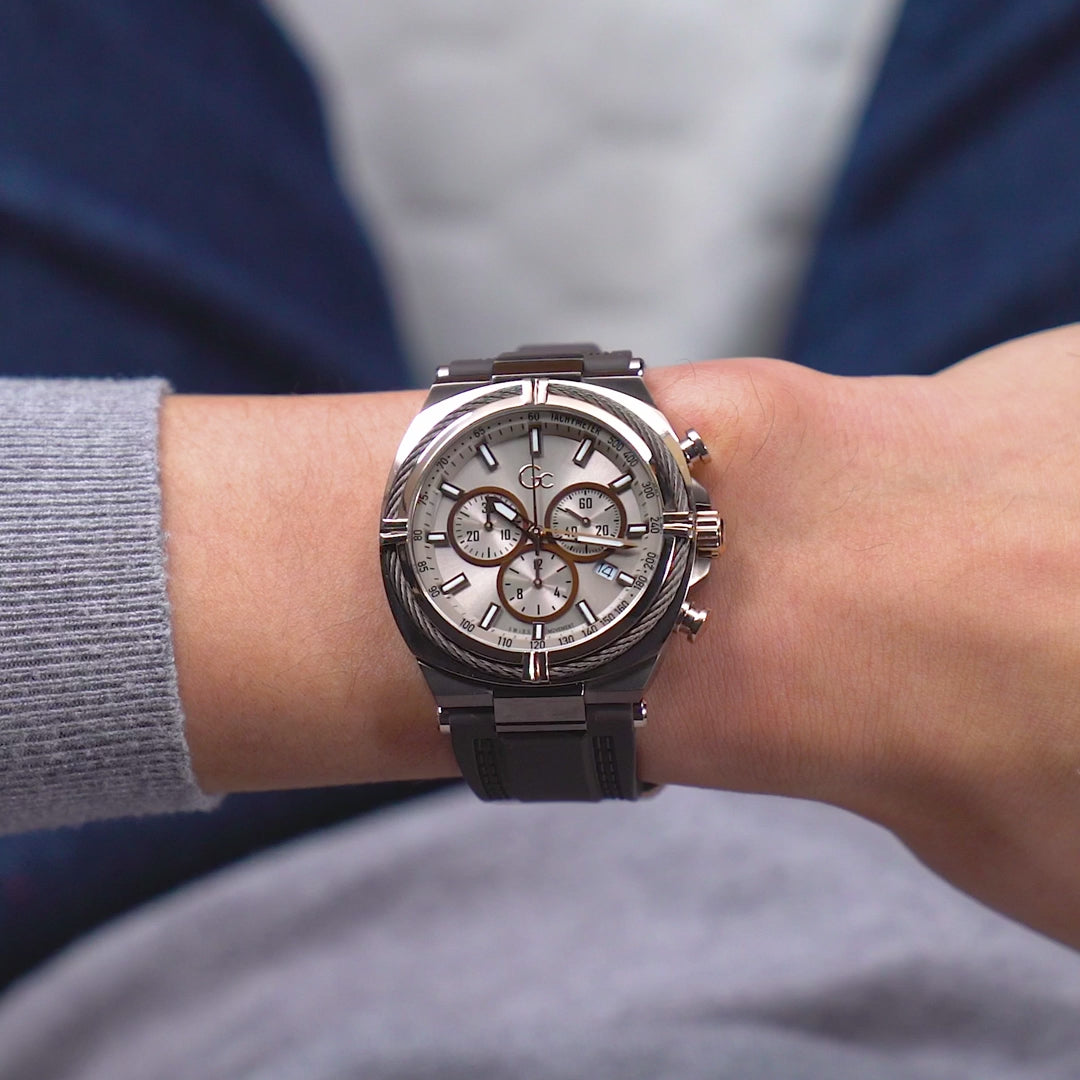 With its unique cable-wire on top ring - the Gc IronClass and its 43mm cushion case and chronograph movement shows a mix of coolness and sophistication. This warm brown and rose gold PVD version hosts a soft earthy beige dial and features a tasty chesnut brown silicone strap.