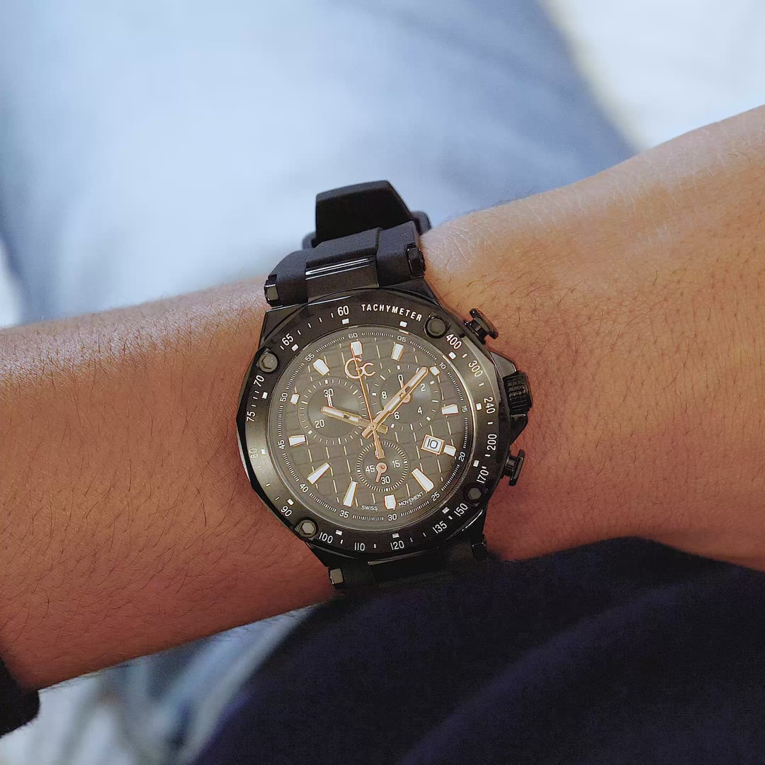 Harness the Gc sporty spirit with this emblematic t full black chronograph. The silhouette of this watch is strikingly masculine thanks to a square pattern dial with rose gold accents for the hands, a black PVD multi-faceted bezel, iconic screw design details, polished and black silicone strap.